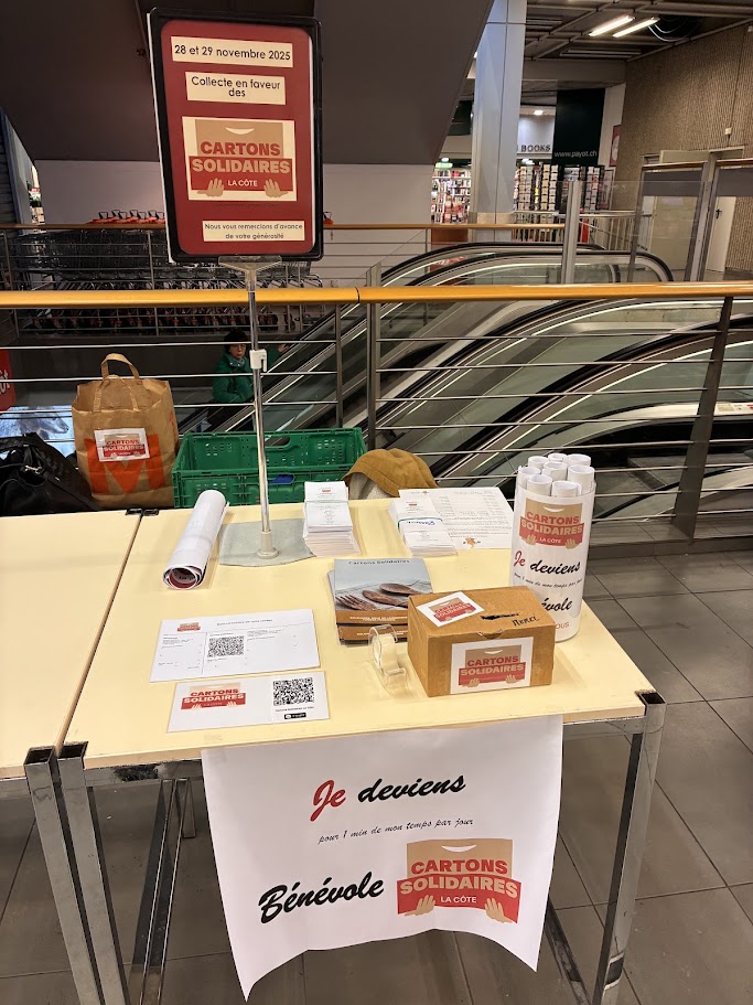 Nous étions présent dans 4 magasins entre Nyon et Gland le 28 et 29 Novembre 2025. Plus de 20 tonnes récoltées grâce à votre générosité et énormément de cartons déplacés!